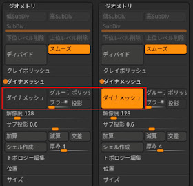 ただし、ここから処理が若干異なってきますまずジオメトリーの[ダイナメッシュ]にチェックを入れます。上図のように選択している状態です。