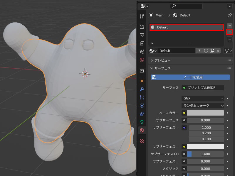 右端の[マテリアルプロパティー]をクリックして[Default]を(−)で削除してから・・・