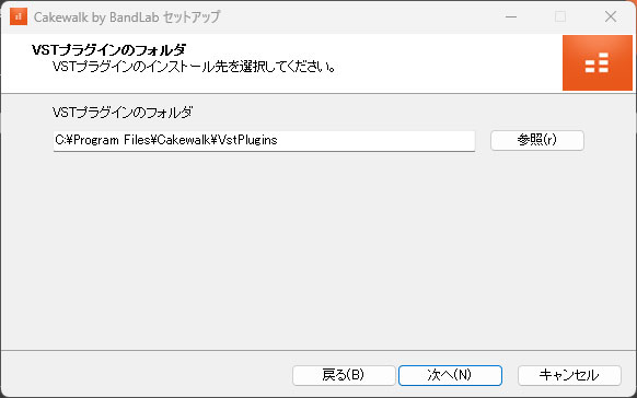 VSTプラグインフォルダのインストール先を指定します。基本的に何もしないで[次へ]をクリックでOK。
