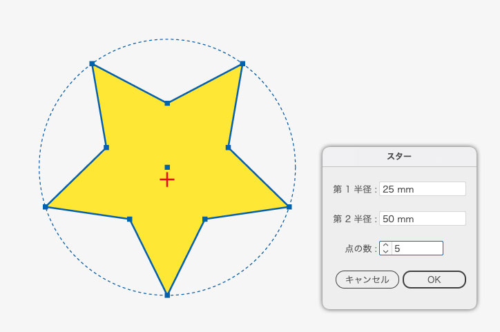 点の数は余り多いと結果が面白くないので7ぐらいが上限かもしれません。取りあえず上の設定でスター描画し、45度回転します。実は図の赤い+が回転の中心点になります。ちなみに図形の中心点と回転の中心点は異なります。